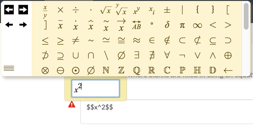 Als leerlingen de cursor in een invoerveld van een vraagtype 'Vergelijkingen' plaatsen, krijgen ze een pop-up te zien die overeenkomt met de hierboven beschreven widgetinstellingen. Voor het gebruiksgemak heeft de pop-up de volgende mogelijkheden die je kan overwegen aan de leerlingen mee te geven: