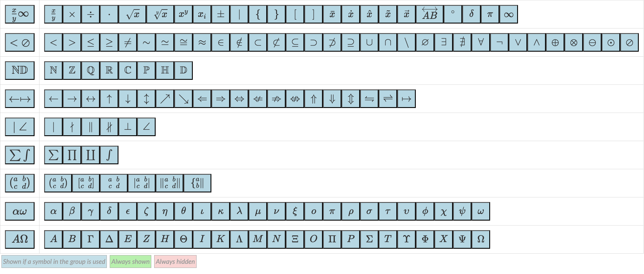 - Een is de standaardkleur. Als alle knoppen blauw zijn, toont het pop-upkader in de leerlingenweergave alleen de symbolen en notatievormen die nodig zijn om alle vragen correct te kunnen beantwoorden, evenals eventueel enkele symbolen die tot dezelfde groep behoren als die van de correcte antwoorden. Bijvoorbeeld: als het symbool "is een element van" (∈) vereist is voor een antwoord, worden standaard ook enkele andere tekens uit de verzamelingenleer mee weergegeven. Op die manier wordt juiste antwoord niet verklapt.