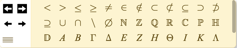 - Een kan worden gebruikt om tekens of notatievormen expliciet uit het pop-up te verwijderen die er anders in zouden staan. Als je bijvoorbeeld een ietwat eenvoudigere oefening wil opstellen waarbij leerlingen enkel alleen hoeven aan te geven of iets een element is van iets anders (∈) of niet (∉), kan je overwegen om de knoppen voor de andere elementen uit de verzamelingenleer (⊂ ⊄ ⊃ ⊅ enz.) rood te maken.